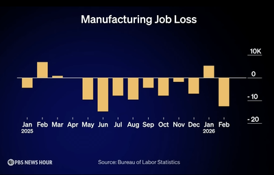 The News Hour included two infographics in this segment. One shows manufacturing job losses since President Trump took office in January 2025. The other states how many manufacturing jobs were lost over a more than 20 year period. Examine the infographics and then discuss the questions below —