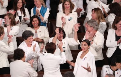 - Remarks about women in the State of the Union: Take a look at the photo below. Why are the Democratic Congresswomen cheering in the photo? Why did they all wear the same color? What does the green pin that says E.R.A. stand for?