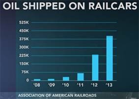Six years ago, U.S. railways carried just 9,500 carloads of crude each year. But today, as huge amounts of oil are produced in states like North Dakota far from traditional pipeline infrastructure, that figure has jumped to more than 400,000.