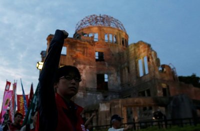 The caption of the second picture reads: "Japanese demonstrators protest against President Barack Obama and Japanese Prime Minister Shinzo Abe visiting Hiroshima, in front of the Atomic Bomb Dome at the Peace Memorial Park in Hiroshima, Japan on May 26, 2016, a day before the leaders arrive in the city. Photo by Toru Hanai/Reuters"