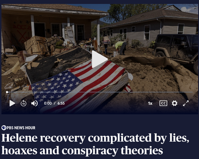 Oct. 9. 2024: Hurricane Helene https://www.pbs.org/newshour/show/helene-recovery-complicated-by-lies-hoaxes-and-conspiracy-theories
