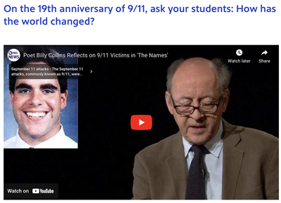 Share this excerpt of Tuesday and Sunday from the longer poem with students, reading aloud together or ask participants to annotate a copy of the poem. [Note: September 11, 2001, was a Tuesday]