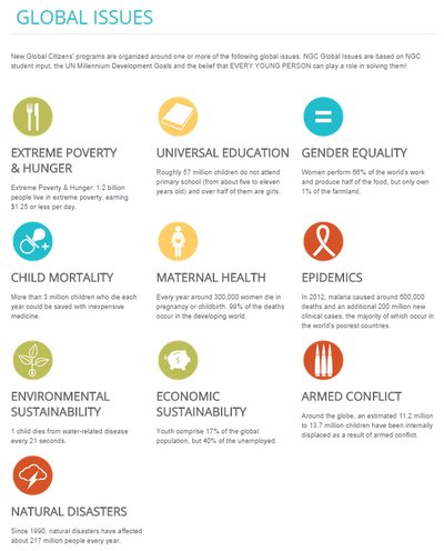 aims to empower students to become change agents, leaders and advocates to solve the world's greatest challenges. Through engaging classroom, after-school, and professional development content, NGC connects students to 10 global issues that challenge communities across the globe.