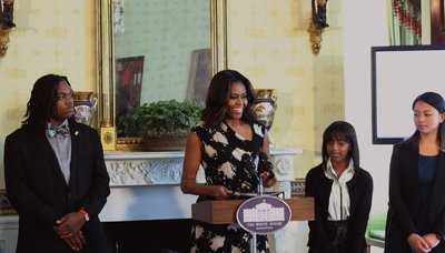First Lady Michelle Obama congratulated the students and spoke about poetry's ability to connect people of different backgrounds through shared emotion and experience. Creative writing was an important outlet for her as a child, she said, both as a means of remaining occupied during difficult times and as a way to express herself.
