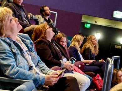 Cammie Newmyer (middle) listening to and watching the video of the just released Brian May (founding member of Queen and astrophysicist) song "New Horizons" during a talk by principal investigator of that expedition, Dr. Alan Stern. Photo courtesy of Cammie Newmyer