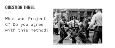 Then, when we viewed the segment about the Children’s March, I asked students if they agreed with the strategy of sending children out to protest segregation in Birmingham. This inquiry led to a lively discussion about protest strategy in general.
