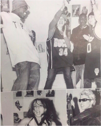 An image from a school lip sync contest circa 2004, when Ms. Susie Freeman Kaufman, a fellow social studies teacher of Sari Beth Rosenberg's at the time, and she performed with our students on stage. Courtesy: Sari Beth Rosenberg
