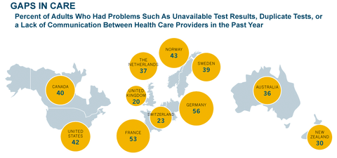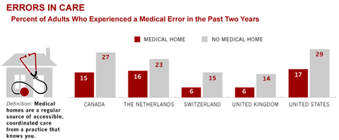 A new report from the Commonwealth Fund painted a pretty dismal picture of the American health care industry this week. But if you don’t have time to read the whole thing, these four graphics — based on a poll of more than 18,000 adults in the United States and 10 other high-income countries — should do the trick. First, a reminder of how much we spend compared to other wealthy nations: But is that top-dollar treatment getting us the best care in the world? Survey says: No. In the past year, 42 percent of Americans reported coordination gaps related to medical records or tests, or communication failures between providers. A fourth said that their medical records or test results were not available during a scheduled visit or that tests were duplicated. That’s nearly double the rates reported in the United Kingdom and Switzerland. Americans are much more likely than those in the other high-income countries examined to struggle with medical debt and forgo needed care due to costs. A little more than a quarter were simply unable to pay their medical bills in the past year or encountered serious problems doing so. One to 14 percent of adults in the other countries surveyed reported the same. In the United States, 42 percent said they had not visited a doctor, filled a prescription, or had not received recommended care. That’s twice the rate for every other country except for Australia, New Zealand, and Germany. In every country surveyed, patients who have a “medical home” — an accessible primary care practice that knows their medical history and helps coordinate care — reported better coordination, fewer medical errors and test duplication, and greater satisfaction with care than those without one. But here, too, American health care comes up short. A greater percentage of patients in the United States — both those with and without a medical home — said they experienced a medical error at some point in the last two years. All graphics courtesy of the Commonwealth Fund. A free press is a cornerstone of a healthy democracy. Support trusted journalism and civil dialogue. Donate now