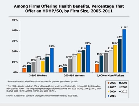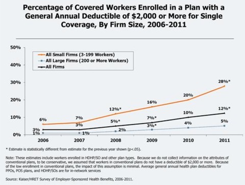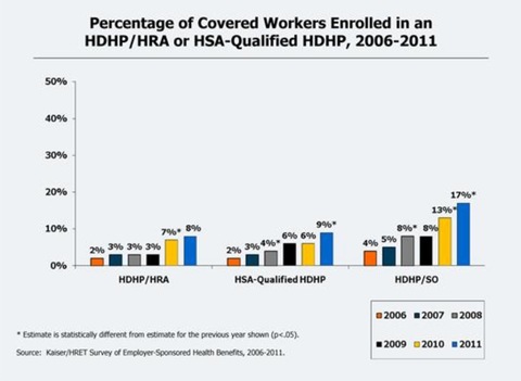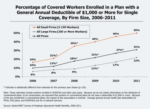 The name pretty much says it all: high-deductible health insurance plans. Higher deductibles, cheaper premiums. But if you think the surprises end there, brace yourself for one more: Proportionally, these plans are growing faster than any other type in the United States. In 2006, only 10 percent of workers with employer-based insurance were enrolled in a high-deductible plan. Today, it’s closer to 31 percent, according to the Kaiser Family Foundation. It’s a “quiet revolution,” said Dr. Drew Altman, president of the foundation. “It’s a big change in what health insurance is, which has been happening under the radar screen in our country without a lot of scrutiny, attention or debate.” On the PBS NewsHour on Friday, health correspondent Betty Ann Bowser will explore what’s behind the “revolution,” how it’s impacting the health of employees and why some analysts say it may help bring down health care costs across the system if patients have “more skin in the game.” But first, some visuals. Click each graphic to see a larger version. Deductibles of $1,000 or More Accounting for 50 percent of the employee insurance plans at small businesses, high-deductible plans are almost “commonplace” these days, said Matthew Rae, a senior policy analyst for KFF and one of the authors of the foundation’s 2011 Employer Health Benefits Survey. Why the sudden spike in all of these plans? In a nutshell: “The cost of premiums has just really gone up,” Rae said. “Employers have been trying to find ways for them to lower premiums. And offering a high deductible is one of those ways.” In 2001, the average insurance premium for a family of four would have been $7,000. Today, it’s about $15,000. The average premium for a high-deductible plan is about $13,000. Deductibles of $2,000 or More In 2006, just 3 percent of workers in employer-sponsored health plans had a deductible of more than $2,000. Now it’s 12 percent. Can’t wrap your head around a deductible that high? Some employees actually prefer it, Rae said. “Many times, if a worker has a choice, they go with the high-deductible plan just because they want to have a smaller premium contribution,” he said. “If you’re healthy and you don’t plan on using a lot of medical care and you’re just hoping to avoid a catastrophe situation, then that plan would make a lot of sense for an individual worker.” Savings Options Since the early 2000s, employers are increasingly coupling high-deductible health plans (HDHP) with health “savings” accounts that help workers to partially — or sometimes completely — match the deductible. Known as Health Reimbursement Arrangements (HRAs) or Health Savings Accounts (HSAs), both of these options allow for the tax-free deposit and withdrawal of cash for qualifying medical expenses. In an HRA, the company finances and controls the account, often allowing remaining funds to roll over from year to year. But when an employee leaves the company, the money usually returns to the firm. HSAs, on the other hand, allow both workers and employers to deposit money tax free. Employees also get to keep the account after they leave their job, allowing for easy transfer between companies. On average, U.S. firms that contribute to HRAs chip in $861 for individual coverage and $1,539 for family coverage. For HSAs, the average is $611 for individual coverage and $1,069 for families. Forecast: More of the Same? Among large firms with employer-sponsored health benefits, 41 percent now offer at least one high-deductible health plan with one of the two savings options (HDHP/SO). While the total percentage isn’t quite as large for small companies, it’s still a significant shift, Rae said. “For small firms — especially very small firms — many are likely to only sponsor one plan type,” he said. “For more and more of them, that one plan type is a high-deductible health plan with a savings option.” And Rae doesn’t see those numbers changing any time soon. “With the costs of premiums continuing to increase, there’s no reason to think that we’re not going to see that kind of increase over the next couple of years,” he said. Do you have specific questions about the benefits and drawbacks of high-deductible health insurance plans? Submit them in the comments sections, by email at onlinehealth@newshour.org, or on Twitter @jasokane. We’ll have financial experts from the insurance and consumer-protection worlds answer those questions next week on our Health Page. Follow @jasokane A free press is a cornerstone of a healthy democracy. Support trusted journalism and civil dialogue. Donate now