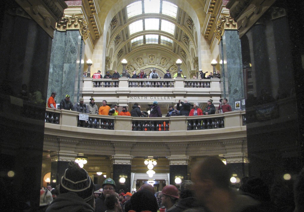 MADISON, Wis. — About 2,000 construction workers, electricians, carpenters and other union members rallied at the Wisconsin state Capitol on Tuesday, pushing back against a fast-tracked right-to-work bill backed by Republicans and Gov. Scott Walker. The gathering was larger than most at the Capitol, but paled in numbers and intensity to the protests seen four years ago when Walker pushed through his measure that effectively ended collective bargaining for most public workers. Rallies then lasted for weeks and grew as large as 100,000 people. “Let’s be loud today and let them hear us,” Phil Neuenfeldt, president of the Wisconsin AFL-CIO, said at the rally where people sang, chanted and booed references to Republicans pushing the issue. Right-to-work laws, in place in 24 states, prohibit private-sector companies from reaching labor agreements in which workers have to pay fees to the unions as a condition of employment. Indiana and Michigan were the two most recent states to pass such a law, in 2012 and right-to-work was also being debated this year in the New Mexico Legislature. Walker, a likely 2016 presidential candidate, over the past four years has said that right-to-work wasn’t a priority, wouldn’t come up this session and was a distraction from his agenda that could lead to protests again that would hurt the state’s economy. But on Friday, after legislative Republicans made the surprise announcement that they were moving ahead with it this week, Walker said he would sign the bill. He has been a longtime backer of right-to-work and had proposed it as an Assembly member in 1993. An all-day Senate Labor Committee hearing on the bill was slated to end Tuesday evening, with the Republican-controlled panel voting at the end on sending the measure to the full Senate. Debate there was to begin Wednesday, with the Assembly taking it up next week. Economists, academics, representatives from think tanks, union members and others testifying at the hearing presented conflicting studies and research on the potential impact of a right-to-work law. “We need to make Wisconsin more competitive and this certainly does that,” said Republican Senate Majority Leader Scott Fitzgerald, the bill’s sponsor. Fitzgerald and other supporters argued in the hearing that a right-to-work law would raise wages, give workers freedom to choose whether to pay union dues and improve the economy. Opponents said the measure will lower worker pay and allow non-union members to benefit from protections and benefits negotiated by the union. Unions have to represent both members and nonmembers in workplace grievances and in other situations. Gordon Lafer, a professor at University of Oregon Labor Education and Research Center, testified against the bill, saying Wisconsin does better than right-to-work states on a variety of measures, including income, poverty levels and violent crime. “Right-to-work states should be saying, ‘How can we become more like Wisconsin?’ — not saying, ‘How can Wisconsin become more like Mississippi and Alabama?'” Lafer said. The NFL Players Association issued a statement opposing it as well, saying right-to-work would hurt union workers at Lambeau Field where the Green Bay Packers play. The right-to-work debate comes in the wake of the 2011 fight over Walker’s law that effectively ended collective bargaining for most public workers. That law also prohibited the automatic withdrawal of union dues for public workers, like the right-to-work measure would do in the private sector. Walker administration spokesman Cullen Werwie said between 1,800 and 2,000 people were inside and outside the Capitol at midday and there had been no arrests. After the rally, protesters filed into the Capitol rotunda and joined the ongoing hearing. While union members were vowing to fight the measure and try to sway Republicans to vote against it, some were resigned to defeat given GOP majorities and Walker’s support. “I think it’s inevitable,” said Sally Feistel, a United Steelworkers union leader from Menasha. ___ Associated Press writer Dana Ferguson contributed to this report. A free press is a cornerstone of a healthy democracy. Support trusted journalism and civil dialogue. Donate now