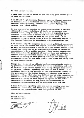 Leave your feedback Share Copy URL https://www.pbs.org/newshour/nation/read-edward-snowdens-supposed-letter-to-german-lawmaker Email Facebook Twitter LinkedIn Pinterest Tumblr Share on Facebook Share on Twitter Read Edward Snowden’s supposed letter to German lawmaker Nation Nov 1, 2013 4:22 PM EDT Edward Snowden allegedly told a German lawmaker that he is willing to cooperate with investigations and even testify concerning NSA spying. The former NSA employee, who is currently in Russia having been granted temporary asylum, supposedly handed a letter containing his intentions to German Green Party lawmaker Hans-Christian Ströbele after a meeting in Moscow. The full text of the letter can be read below: > To whom it may concern, I have been invited to write to you regarding your investigation of mass surveillance. I am Edward Joseph Snowden, formerly employed through contracts or direct hire as a technical expert for the United States National Security Agency, and Defense Intelligence Agency. In the course of my service to these organizations, I believe I witnessed systemic violations of law by my government that created a moral duty to act. As a result of reporting these concerns, I have faced a severe and sustained campaign of persecution that forced me from my family and home. I am currently living in exile under a grant of temporary asylum in the Russian Federation in accordance with international law. I am heartened by the response to my act of political expression, in both the United States and beyond. Citizens around the world as well as high officials – including in the United States – have judged the revelation of an unaccountable system of pervasive surveillance to be a public service. These spying revelations have resulted in the proposal of many new laws and policies to address formerly concealed abuses of the public trust. The benefits to society of this growing knowledge are becoming increasingly clear at the same time claimed risks are being shown to have been mitigated. Though the outcome of my efforts has been demonstrably positive, my government continues to treat dissent as defection, and seeks to criminalize political speech with felony charges that provide no defense. However, speaking the truth is not a crime. I am confident that with the support of the international community, the government of the United States will abandon this harmful behavior. I hope that when the difficulties of this humanitarian situation have been resolved, I will be able to cooperate in the responsible finding of fact regarding reports in the media, particularly in regard to the truth and authenticity of documents, as appropriate and in accordance with the law. I look forward to speaking with you in your country when the situation is resolved, and thank you for your efforts in upholding the international laws that protect us all. With my best regards, Edward Snowden 31 October 2013 A free press is a cornerstone of a healthy democracy. Support trusted journalism and civil dialogue. Donate now