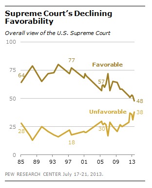 By — News Desk News Desk Leave your feedback Share Copy URL https://www.pbs.org/newshour/nation/supreme-court-steps-back-into-business-with-record-low-approval-ratings Email Facebook Twitter LinkedIn Pinterest Tumblr Share on Facebook Share on Twitter Supreme Court steps back into business with record-low approval ratings Nation Oct 7, 2013 4:00 PM EST Image courtesy of Pew Research. SCOTUS returns to the bench today to record-low favorability ratings. According to analysis by Pew, only 48 percent of Americans had a favorable view of the court, while 38 percent had an unfavorable one. The July survey is the most recent and for the first time produced an approval rating below 50 percent. Broken down by political party, the gap between Democrats and Republicans’ views of the court is narrowing. While 54 percent of Democrats had a favorable opinion of the court in July, 48 percent of Republicans had the same. One year prior and following the court’s’ upholding of the ACA, the spit was 64 percent and 38 percent, respectively. For more legal rundown, the AP wrote up what to be watching for as the new Supreme Court term begins. H/T Elizabeth Shell A free press is a cornerstone of a healthy democracy. Support trusted journalism and civil dialogue. Donate now By — News Desk News Desk