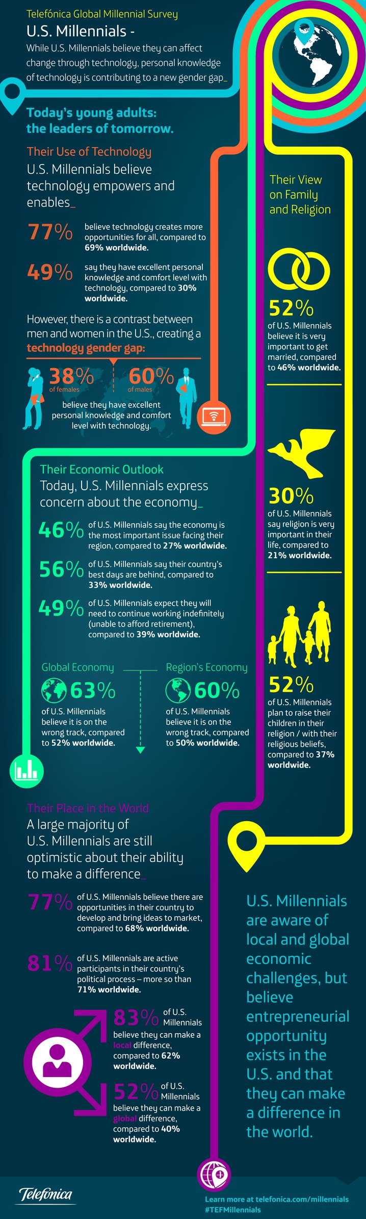 If you still aren’t sure about how large a role technology will play in creating job opportunities in the future, or whether China rather than the U.S. is the main driver of the global economy, or how worried the younger generation is about climate change, there’s a just-released global survey to provide answers. It’s a kind of a “millennial crystal ball” that came about when Telefonica, the giant telecommunications company based in Spain, paired up with the Financial Times to sponsor the largest global study of millennials ever conducted: more than 12,000 respondents, in 27 countries, across six continents. A majority of young people still say they believe they ‘can make a global difference.’ The survey was weighted in favor of those with a college education, and some of the findings confirmed what we’ve already learned about the younger generation in the United States and Western Europe: they’re worried about the economy and whether they’ll have the chance to do as well as their parents’ and grandparents’ generations. (No surprise, since both regions are struggling with slow economic growth.) In the short run, majorities in every region say it is difficult for their age cohort to “progress from school to the workplace environment.” So it was striking that most millennials in Asia and Latin America especially, as well as in Central and Eastern Europe, and even in the Middle East and Africa, responded that, despite obstacles like these, they still believe their “country’s best days are ahead.” At the same time, a majority of young people on every continent except Latin America believe technology has widened the gap between rich and poor, a separation they suggest they’d like to see closed. And there is another notable gap in the perceptions of technology: gender. Young men are far more likely than young women to consider themselves on the cutting edge of technology, or to say technology has been influential in shaping their outlook on life. This could have implications for the ability of women to influence the economy, since technology and jobs will go hand-in-hand in many sectors. One other finding that probably shouldn’t surprise us is the high proportion of millennials outside the United States who say climate change is a “very pressing” issue: 70 percent in Latin America, 59 percent in Asia and 49 percent in Western Europe. In the U.S., only 36 percent say the same, perhaps because of the paramount worry here over jobs and the economy. What also comes through in this global survey, the most comprehensive of its kind, is a stubborn personal optimism that is often directly proportional to the level of political freedom respondents enjoy. In the U.S., where worries about jobs and debt trump all other concerns, a majority of young people still say they believe they “can make a global difference.” Larger majorities agree across most of Latin America, South Africa, India and South Korea. But in China, with its Communist government (and despite explosive economic growth), only 27 percent of young people say they believe they can make a global difference, and even fewer, 22 percent, say so in Russia, where the government of Vladimir Putin is increasingly repressive. The odds are slim to none, but wouldn’t it be heartening if the leaders in these and other countries spent a little more time listening to these young people and thinking about the contributions they have to make, both inside their own borders, and beyond? Graphic from Telefonica’s Global Millennial Survey Follow @JudyWoodruff A free press is a cornerstone of a healthy democracy. Support trusted journalism and civil dialogue. Donate now