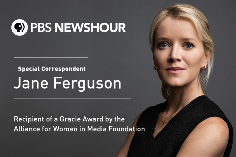 Apr 13 PBS NewsHour Special Correspondent Jane Ferguson Named Recipient of a 2022 Gracie Award Arlington, VA (April 13, 2022)—The Alliance for Women in Media Foundation today announced that PBS NewsHour special correspondent, Jane Ferguson, is the recipient of a 2022 Gracie Award in the Reporter/Correspondent (TV National) category for her reporting in… Continue reading