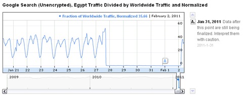 After a widespread shutdown of Internet and mobile phone service in Egypt as street protests intensified last week, there were reports Wednesday that Web access was restored in the country. Google’s Transparency Index has been tracking web traffic to its services in Egypt. Note the drop on Jan. 27 and the uptick on Feb. 1 — although Google cautions that these data are still being interpreted. Google has also compiled a crisis response page with resources for people trying to get out of Egypt — or at least get their messages out via voice messages posted to Twitter or raw footage on CitizenTube. (Update 6:20 p.m.: Alive in Egypt is a site that is translating some of those voice messages.) The crisis page has a map, compiling geographic reports of clashes, protests and other noteworthy places: [Full disclosure: the NewsHour has previously partnered with [Google](http://blog.google.org/2010/06/bob-dudley-chief-executive-for-bp.html), YouTube and [CitizenTube](http://www.youtube.com/user/videoyourvote) on a variety of news projects.] Meanwhile, Storyful, a social media news curation tool created by journalists, has been tracking minute-by-minute developments, including reports of gunfire and Molotov cocktails being thrown in and around Tahrir Square. As the Egypt story continues to unfold, the NewsHour has been compiling other sources and new ways to track the developments. Have a good suggestion? Please leave it in the comments. A free press is a cornerstone of a healthy democracy. Support trusted journalism and civil dialogue. Donate now