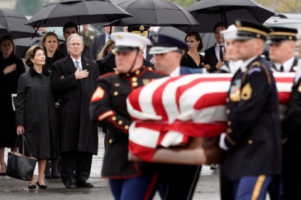 Leave a comment 0comments Share Copy URL https://www.pbs.org/newshour/show/family-friends-recall-the-profound-legacy-of-george-h-w-bush Email Facebook Twitter LinkedIn Pinterest Tumblr Share on Facebook Share on Twitter Transcript Audio The final funeral for George H.W. Bush was held today at his family church in Houston. Some 1,200 mourners gathered to honor the late president. Following the service, Bush’s casket was transported to College Station, and he was laid to rest next to his wife of 73 years, Barbara, and daughter Robin on the grounds of the George H.W. Bush Presidential Library and Museum at Texas A&M University. Read the Full Transcript Notice: Transcripts are machine and human generated and lightly edited for accuracy. They may contain errors. Amna Nawaz: The 41st president of the United States has reached his final resting place tonight, culminating a life story of 94 years. George Herbert Walker Bush was buried today, after a journey by train from a final funeral.Some 1,200 mourners gathered at the Bush family's Houston church, St. Martin's Episcopal, after three days of memorial events in Washington. Mr. Bush's former Secretary of State James Baker reflected on the man he knew for decades as both friend and leader. James Baker: I have always been proud that George Bush used to describe our relationship as one of big brother and little brother.He used to say that one of the things he liked best about me was that I would always tell him what I thought, even when I knew he didn't want to hear it. But he had a very effective way of letting me know when the discussion was over.(LAUGHTER) James Baker: He would look at me and he'd say: "Baker, if you're so smart, why am I president and you're not?"(LAUGHTER) Amna Nawaz: Mr. Bush's grandson, Texas Land Commissioner George P. Bush, recalled not a statesman, but a grandfather. George P. Bush: Today, I stand before you as the oldest grandson of the man I simply knew as Gampy. George Herbert Walker Bush was the most gracious, most decent, most humble man that I will ever know. Amna Nawaz: One of the president's favorite country groups, the Oak Ridge Boys, performed an a cappella version of "Amazing Grace."And, after more than an hour, the service ended with "Battle Hymn of the Republic," before the flag-draped casket was carried from the church.The 41st president, accompanied by family and friends, then traveled 70 miles by train, past crowds of well-wishers, to College Station, Texas, and his final resting place on the grounds of his presidential library. Mr. Bush was buried during a private service, alongside his late wife, Barbara, and daughter Robin, who died of leukemia as a child. Listen to this Segment Watch Watch the Full Episode PBS NewsHour from Dec 06, 2018