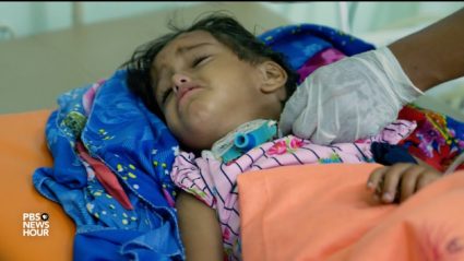 By — Jane Ferguson Jane Ferguson Leave a comment 0comments Share Copy URL https://www.pbs.org/newshour/show/fighting-starvation-and-disease-yield-grim-crisis-in-yemen Email Facebook Twitter LinkedIn Pinterest Tumblr Share on Facebook Share on Twitter Transcript Audio The United Nations calls Yemen the site of the worst humanitarian suffering in the world. Years of war have caused widespread starvation and disease; supply routes are blocked by fighting, and fuel and food prices have spiked. With the economy destroyed, many Yemenis cannot even afford transportation to the medical facilities they so desperately need. Special correspondent Jane Ferguson reports. Read the Full Transcript Notice: Transcripts are machine and human generated and lightly edited for accuracy. They may contain errors. William Brangham: This month, the United Nations announced that 73,000 Yemenis are living under famine conditions, and millions more risk dying from hunger as the country's humanitarian crisis spirals downward.Since 2014, Yemen has been torn apart by a civil war, pitting rebels, who are allied with Iran, against the Yemeni government, which is allied with Saudi Arabia. Saudi Arabia, in turn, receives military support from the United States.Special correspondent Jane Ferguson managed to visit rebel-held areas for the "NewsHour" earlier this year, and she returned this month to provide this exclusive report on the worsening situation. And a warning: Some of the scenes in this story are very disturbing. Jane Ferguson: When Ikram Bakil's mother removes her clothes, the extent of her suffering is clear. She is starving. Below the waist, her body shrinks away to nothing. This is what famine does to a 4-year-old child.Her mother, Aisha, cannot bear to watch her waste away. She is overcome by a wave of grief, as she tells us of her struggles to keep Ikram alive. Aisha Nasser (through translator): My husband's family says I shouldn't worry about it. When I asked them to give me money, they said Allah will take care of her. I took her to the hospital. I sold a ring for $27 and got her treatment, but it didn't work. They sent us here, and now they are treating her, but she is still sick. Jane Ferguson: The war in Yemen has devastated the economy. Millions are out of work, and the price of food and fuel has spiked. It is home to the worst humanitarian suffering in the world, with countless families unable to feed themselves.The U.N. says two-thirds of Yemenis need food aid and millions are on the brink of famine. I came here in June and found unimaginable misery. Since then, fighting has intensified across the country, and I returned to find the crisis even worse.This hospital is in the capital, Sanaa. Only the lucky ones make it this far. Millions are stranded in rural areas. To find some of those, we headed out to Hajjah, high up in the North Yemen mountains, where the main regional medical center is overflowing with crowds of desperate parents and children.Here, we found Dr. Al Maqtali working hard to save lives. But she only has medicine to give them, when what they really need is food. So they come back again and again, worse each time.How do you feel whenever you are treating them? Dr. Fatoum Al Maqtali: I am feeling very, very sad because I can't help them. When they came here in the outpatient, they are moderate malnourished. I cannot give them food. From where I will give them food?After that, they are coming to the ward with severe malnutrition. This is the process, moderate to severe and dying. Jane Ferguson: So you are forced to watch them get worse. Dr. Fatoum Al Maqtali: Yes. Jane Ferguson: She's afraid this is only tip of the iceberg. Many of the worst cases, she doesn't see. That's because, even though the health care in Yemen is free, people cannot afford the cost of transportation to the hospital.Do you fear there's a lot that are still out there? Dr. Fatoum Al Maqtali: Yes. For one coming here, there is 20 not coming, maybe 20, 30, 50. We don't know. Jane Ferguson: We headed further into the countryside. Here at a basic rural clinic, parents waited in line for their children to get examined.They are all from the same area?The daily weighing and measuring of tiny arms comes to the same conclusion every time: When the tape shows red, it means severely malnourished.Driving deeper into the mountains, we learned of a family struggling to keep their newest born alive. Here, in their isolated community, they were living only on rice and prayers.Hamoud Abdullah is stunted and unresponsive. He has been malnourished his entire short life. Incredibly, he is 2 years old, but looks like he is just a few months. His mother, Amani, took him to the hospital once before. Amani Ali Nasser (through translator): You could not imagine. When we brought him to the hospital, he was almost dead, and we thought he wouldn't survive. In the hospital, they said he was finished. They gave him oxygen and injections. We stayed for almost a month before returning home. Jane Ferguson: Now he is sick again, and there is no more money left for the journey back to the hospital. Yemen's mothers are surviving on one meal a day, often just bread and tea. They are not getting enough nutrition to be able to breast-feed, and their babies weaken and die.The cost of a simple bus fare has spiked as fuel prices increased due to the war. Half of the country's health facilities are shut, and even if families do make it to one, they then have to pay for a place to stay in the town while the child gets treatment.All too often, they leave the hospital too early, and return to a home where food remains scarce. It's not just hunger that claims the lives of Yemen's children. Diseases have taken hold here, too. Poor sanitation and living conditions as a result of the war have spawned the world's worst cholera outbreak. Every hospital now has to have cholera wards like this.Five-year-old Akram is barely conscious, suffering from dangerously severe 