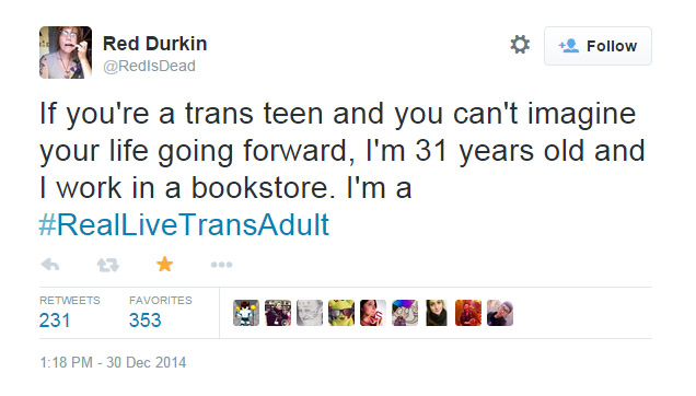 Dec 30 #RealLiveTransAdult emerges on Twitter following transgender teen’s death By Colleen Shalby Earlier today, Twitter user Red Durkin started the hashtag #RealLiveTransAdult -- a conversation that encouraged transgender men and women to share their stories with transgender teenagers. Durkin started the hashtag in response to the suicide note left by transgender 17-year-old… Continue reading