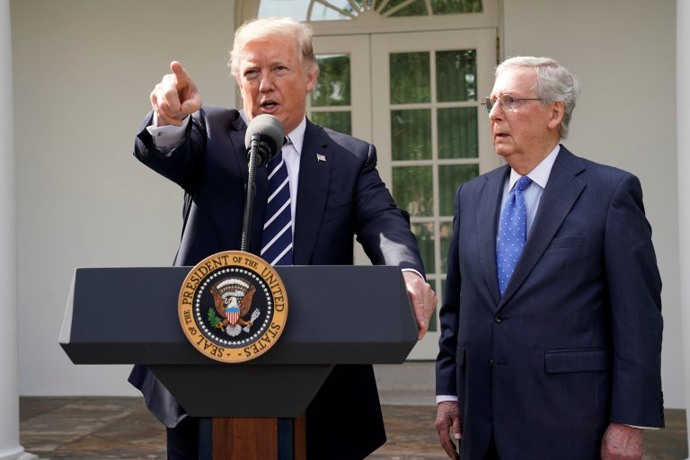 Oct 16 WATCH: Donald Trump stands with Mitch McConnell for Rose Garden press briefing By Laura Santhanam President Donald Trump offered remarks today that wandered from the opioid crisis to the Russia probe and to relief efforts in hurricane-hit Puerto Rico with Senate Majority Leader Mitch McConnell at his side. Continue reading