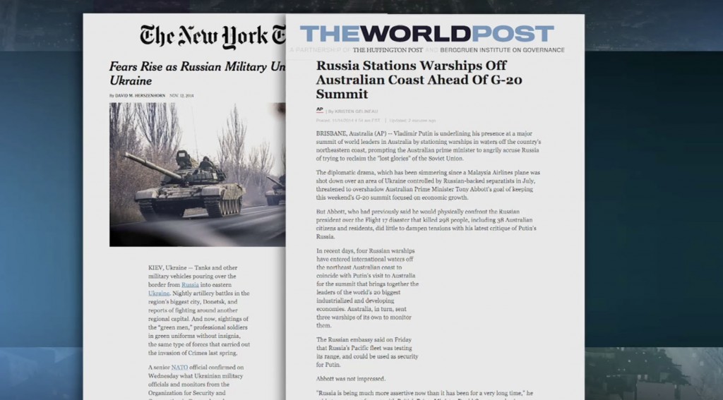Nov 15 Watch PBS NewsHour Weekend full episode Nov. 15, 2014 By PBS News Hour On this edition for Saturday, Nov. 15, 2014, Vladimir Putin is accused of aggression at a contentious meeting in Australia and an expert speaks on whether there is a new cold war on the horizon. In our signature segment from… Continue watching