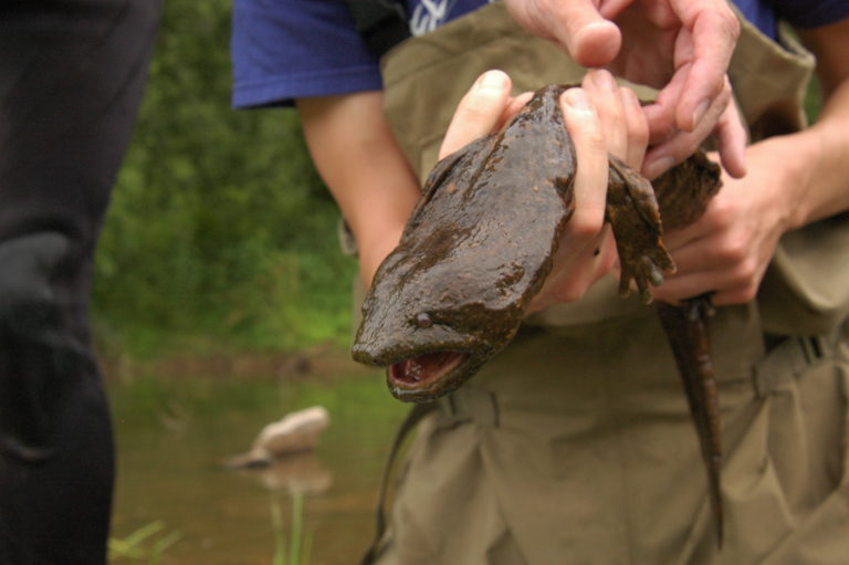 Aug 07 Rustling River Monsters for Science It takes six scientists to catch one hellbender salamander: three to lift the rock, two to hold the fishing nets, and one to dive underwater and grab the creature. Then, holding on is its own challenge, because the animals ooze… Continue reading