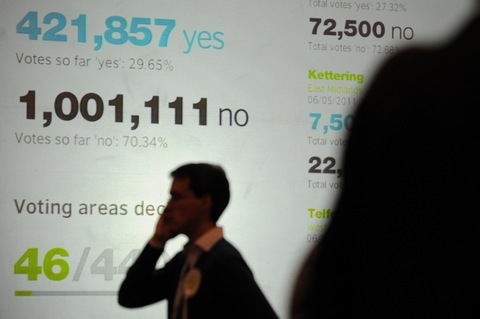 Board showing vote tally of British referendum. (Ben Stansall/AFP/Getty Images) Britain’s junior partner in the national coalition, the Liberal Democrats led by Nick Clegg, got a double whammy Friday when they took a beating in local elections and lost a referendum vote that would have changed Britain’s electoral system in their favor. The referendum would have changed the way members of the House of Commons are elected from a system — like the U.S. — in which the candidate with the most votes wins the seat, to voters ranking a series of candidates according to their preference. If no candidate gets an outright majority, the one with the least votes gets eliminated and the rest go through further rounds of preference votes until one gets more than 50 percent of the vote. This alternative system would have favored the Liberal Democrats, who tend to get more votes nationally than reflected in their number of seats in Parliament. The referendum — a rarity in Britain — was part of an agreement the center-left Liberal Democrats made last year with the center-right Conservatives, led by Prime Minister David Cameron, to form a coalition government. Clegg pushed for the change, while Cameron opposed it. Thursday’s referendum had a number of factors working against it, according to Ned Temko, a journalist and political analyst who writes for the Observer in London. It was held the same day as local elections, and the losses the Liberal Democrats suffered in the local elections appeared to spill over into the result on the referendum, he said. Also, while many British people feel there’s a disconnect between politicians and the electorate, and that the electoral system needs improving, England is an inherently conservative country that doesn’t tend to change something unless there’s an overriding urgent argument to do so, said Temko. In London, where residents were voting only on the referendum and not in local elections, there was a low turnout indicating some indifference to the electoral change, he said. Also a drawback — explaining the referendum itself. “It’s kind of complicated to explain in a way that’s sexy and simple,” he added. “Any argument that requires a minute and a half to explain to an electorate is probably going to be difficult to sell.” The Liberal Democrats also got trounced in local elections, which was not entirely unexpected in light of the government’s cost-cutting measures, said Temko. “Particularly with the scale of public expenditure cuts that had been approved by this government, it was always going to be tough. I think the only thing Nick Clegg and the Liberal Democrats didn’t know the answer to yesterday morning was how tough. And the answer is very,” he said. On the other hand, the Labor Party, bumped out of power in May’s general elections, appeared to be rebounding after gaining council seats in England’s councils in traditionally Labor strongholds, said Temko. But they are still not where they want to be and fared poorly in Scottish parliamentary elections. Labor lost seats to the Scottish National Party, which got a majority in the Scottish assembly — the first time any party has achieved this since the Scottish Parliament’s creation in 1999. (The Guardian mapped the results.) The Scottish National Party is seeking a referendum in the next five years to separate from Britain — something Britain’s Cameron said he would campaign against “with every fiber that I have.” Looking ahead, the defeats will not likely result in Clegg leaving his leadership post in the Liberal Democrats or lead to a disintegration of its coalition with the Conservatives, said Temko. Both parties still need each other and have calculated these losses from cost cuts into their long-term plans, he said. They believe that “when the economy recovers some strength and the results of what they’re doing begin to show through, which they calculate about two or three years down the line, they’ll be in a much stronger position.” View all of our World coverage and follow us on Twitter. A free press is a cornerstone of a healthy democracy. Support trusted journalism and civil dialogue. Donate now