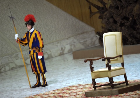 A Swiss guard stands next to an empty seat in the Vatican’s Paul VI hall. Photo by Filippo Monteforte/AFP/Getty Images. Updated March 12: The conclave of cardinal electors met Tuesday to begin voting on the next pope in a secret balloting process. The 115 cardinals will vote once Tuesday and twice each subsequent morning and afternoon until someone gets two-thirds of the ballots. Pope Benedict XVI resigned last month, saying he was no longer up to the rigors of the job. Read all of the NewsHour’s Papal Transition coverage, where we will be tracking developments. Original Story: Cardinals from all over the world are converging on Rome to elect a new leader of the Roman Catholic Church’s 1.1 billion followers. The College of Cardinals is expected to meet Monday to decide when the conclave will begin to choose a replacement for Pope Benedict XVI. He decided to step down Feb. 11 for health reasons. Here’s how the election process is expected to go: Day 1 On the day the conclave begins, the cardinals will celebrate Mass in St. Peter’s Basilica and then head to the Sistine Chapel, where they’ll take an oath of secrecy and pledge to avoid interference by outside groups, writes the Rev. Thomas J. Reese, a senior fellow at the Woodstock Theological Center at Georgetown University. All but the cardinal electors are then ordered to leave the chapel with the words, “Extra omnes,” or “Everybody out,” in Latin. The cardinals can begin voting that day. If no one receives the necessary two-thirds vote to become pope, they meet again the following day for another round of balloting. The Ballot Process The cardinals who collect the ballots and count the votes are selected at random, and new ones are assigned each morning and afternoon. Each cardinal writes the name of his choice on a folded card that he presents at the altar and puts in a lidded urn. The ballots must match the number of cardinals present, or they are burned without being tallied. The first counter writes each name on the ballots on a separate piece of paper, hands the ballot to the next counter who looks at it and gives it to a third observer who reads the name aloud. The ballots are strung together and put in another urn. The ballots are then burned, and chemicals are added to make the smoke white — if a pope is selected — or black if no one gets the two-thirds vote. The process continues with two votes in the morning and two in the afternoon until a new pope is chosen. If after the third day, no one is selected, the voting is suspended for at least a day for prayer and discussion among the cardinal electors. What Happens When the Pope Is Chosen? The newly elected person is asked if he wants to be pope and what he would like his name to be. The name is then announced to those gathered in St. Peter’s Square, and the pope may speak to the crowd. What Will the New Pope Wear? The pope typically wears an elbow-length cape known as a mozzetta, a ceremonial white peaked hat called a mitre (or a zucchetto skullcap on less formal occasions), red shoes symbolizing the blood of martyrs, and a variation of a fisherman’s ring, which shows the pope is a successor of Saint Peter who fished for a living. What Will Happen to Pope Benedict XVI? The former pope will continue to live in the Vatican, keep the name Benedict XVI and will be known as “pope emeritus”. Related Resources: See a slideshow of Pope Benedict’s eight years as head of the Catholic Church: Judy Woodruff talks about Pope Benedict XVI’s legacy with Monsignor Rick Hilgartner of the U.S. Conference of Catholic Bishops, Sr. Christine Schenk of FutureChurch and John Allen, who covers the Vatican for CNN and the National Catholic Reporter: From the Video Vault: On April 19, 2005, Cardinal Joseph Ratzinger was elected to the Catholic Church’s highest office after one of the shortest conclaves in a century. Jim Lehrer reports. Then, Ray Suarez talks to the Rev. Thomas Reese from Italy for analysis of the cardinals’ decision: View more of the NewsHour’s World coverage and follow us on Twitter: Follow @NewsHourWorld A free press is a cornerstone of a healthy democracy. Support trusted journalism and civil dialogue. Donate now