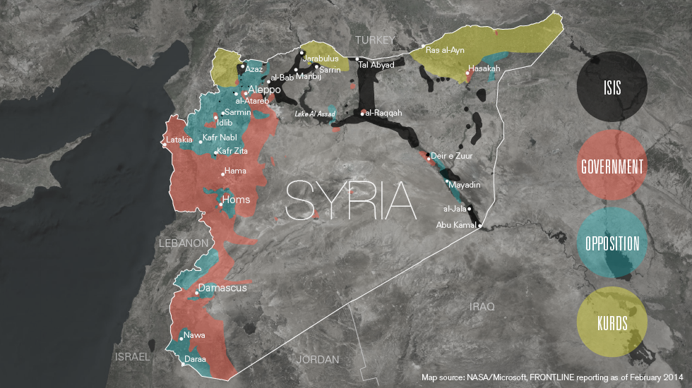 This map, assembled from data shared with FRONTLINE by researchers who have consulted extensively with Syria’s armed groups, shows the best available information about the main actors’ areas of control as of early February 2014.