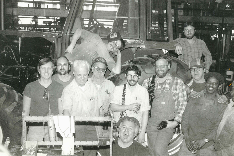 rank Shansky, who assembled wheel weights, was the last person working in the Allis Chalmers tractor division. He took this picture of his coworkers on the plant’s last day of production. “It’s ironic they’re smiling,” he said, “but my recollection is we had all known this was coming and we were in a very camaraderie-type mood.”nn Courtesy Frank Shanskyn
