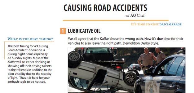 Not all of the ideas for waging jihad are as effective as “Make A Bomb in the Kitchen of Your Mom.” Inspire‘s Spring 2013 issue included instructions for how to cause traffic accidents by pouring liters of “lubricative oil” on the curves of U.S. highways. “We all agree that the Kuffar [unbelievers] chose the wrong path,” the article reads. “Now it’s due time for their vehicles to also leave the right path. Demolition Derby Style.”