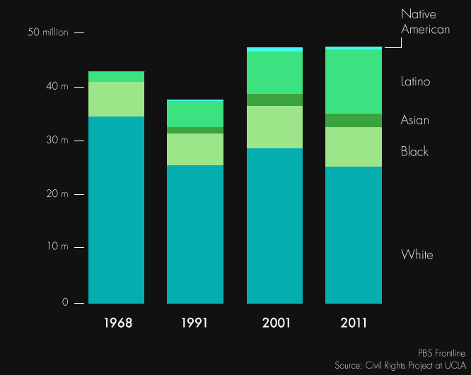 The widening divide in America’s school system has taken place despite a dramatic shift in enrollment trends. Consider that from 1968 to 2011, enrollment among white students fell 28 percent, but grew by 19 percent among black students and a whopping 495 percent among Latinos. By 2011, Latinos had become the most segregated minority group in U.S. schools, even though they accounted for roughly 25 percent of the nation’s 48.7 million public school students. The typical Latino student now attends a school that’s nearly 57 percent Latino, more segregated than blacks and Asians.