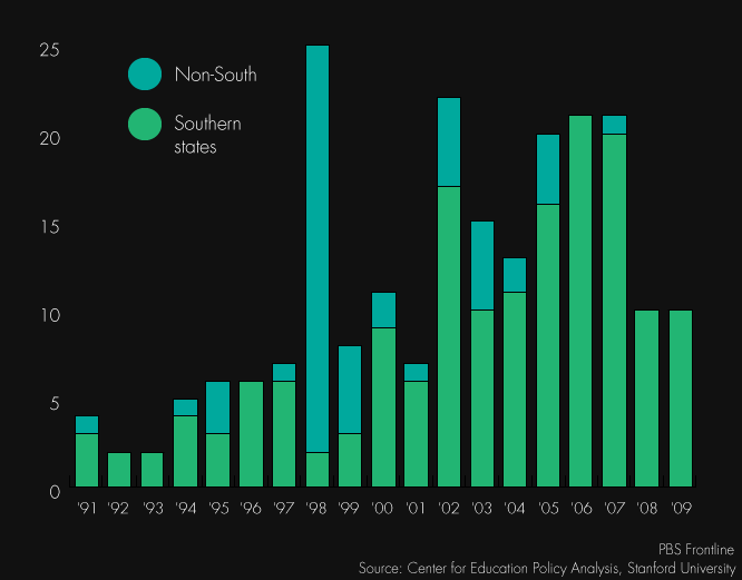 Between 1990 and 2009, courts released 45 percent of school districts under court oversight, according to research from Stanford University’s Center for Education Policy Analysis. The nationwide study, which focused on districts with at least 2,000 students, found that the pace of releases went from about seven per year in the 1990s, to roughly 15 per year during the 2000s. The year with the most releases was 1998, when 21 schools in Indiana alone were removed from oversight.