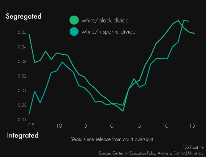 When the Stanford researchers looked at what happens when districts leave court oversight, they found schools typically climb back toward 1, or more segregation. Schools released from integration plans saw the gulf between whites and blacks grow by 24 percent after 10 years as compared to schools still under court order. The split between white students and Latinos grew by 10 percent after a decade.
