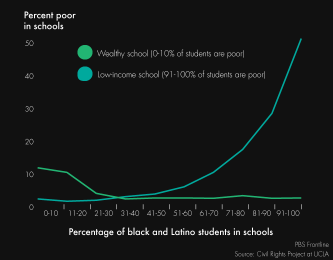 The UCLA research also found strong connections between poverty and segregation, with blacks and Latinos representing more than half of children in schools with the most poverty, and just 11 percent of students in the least impoverished schools. For many black and Latino children, this can often mean less qualified teachers, as well as shoddier facilities and materials.