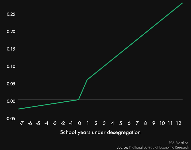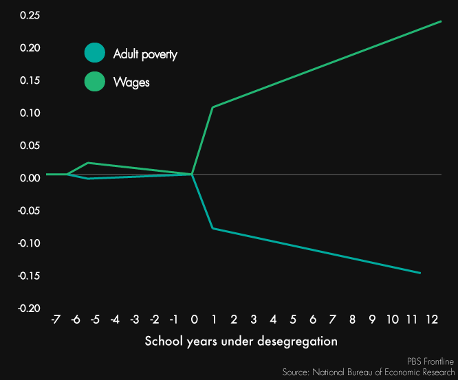 Another benefit of attending a school under court oversight is higher wages later in life, and a smaller chance of experiencing poverty, according to Johnson. His research found that the average effect among blacks of a five-year exposure to court-ordered desegregation was a 15 percent increase in wages. That probability, represented below along the vertical axis, amounted to an extra $5,900 in annual family income, and an 11-percentage point decline in yearly incidences of poverty. Johnson also found that while desegregation led to clearly positive outcomes for blacks, it caused no statistically significant harm for whites.