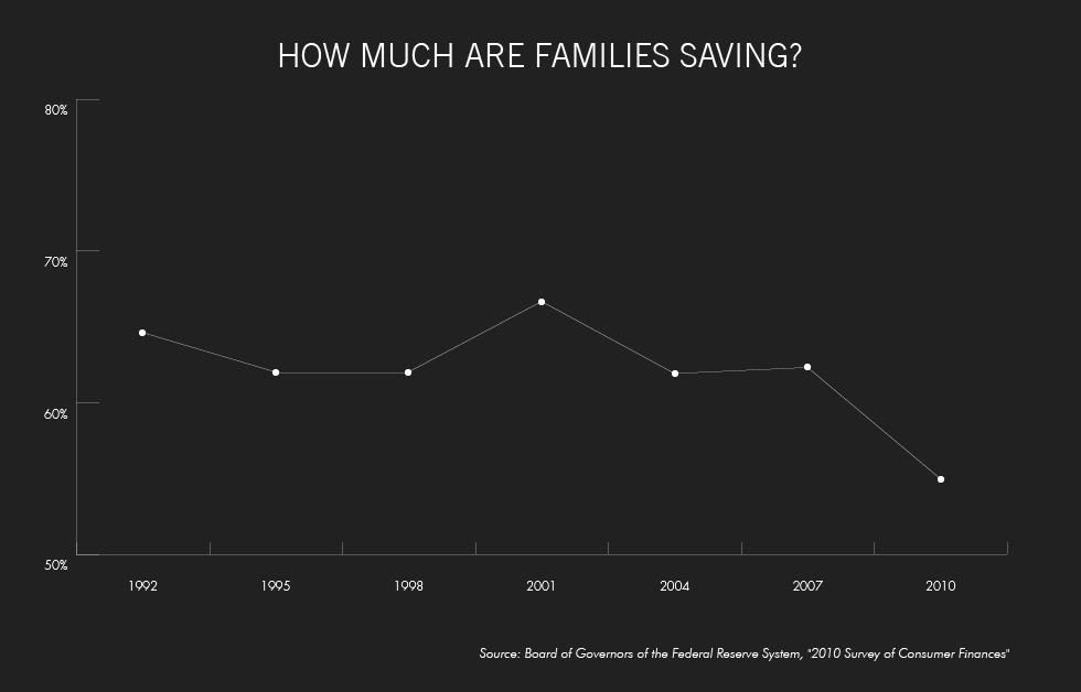 The rise in debt has meant fewer families have the ability to put away money for things like retirement or a child’s tuition bills. In 2001, more than two-thirds of middle class families said they were able to save money in the preceding year. By 2010, that figure was below 55 percent.