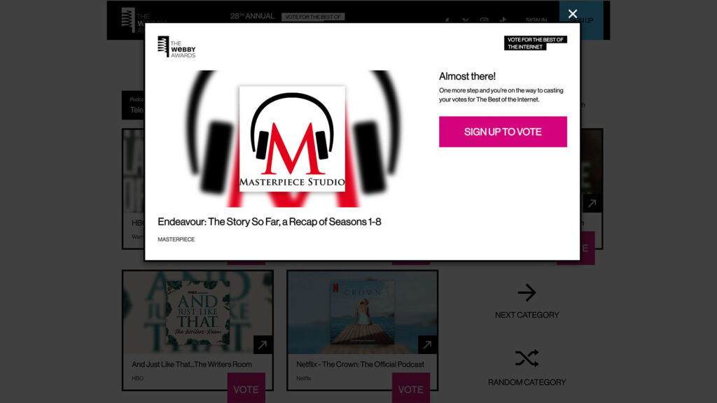 The MASTERPIECE Studio podcast is nominated for a prestigious People’s Voice Webby Award—specifically for the podcast episode entitled, Endeavour: The Story So Far, a Recap of Seasons 1-8. The winners are determined by audience vote, so we need your help to win!