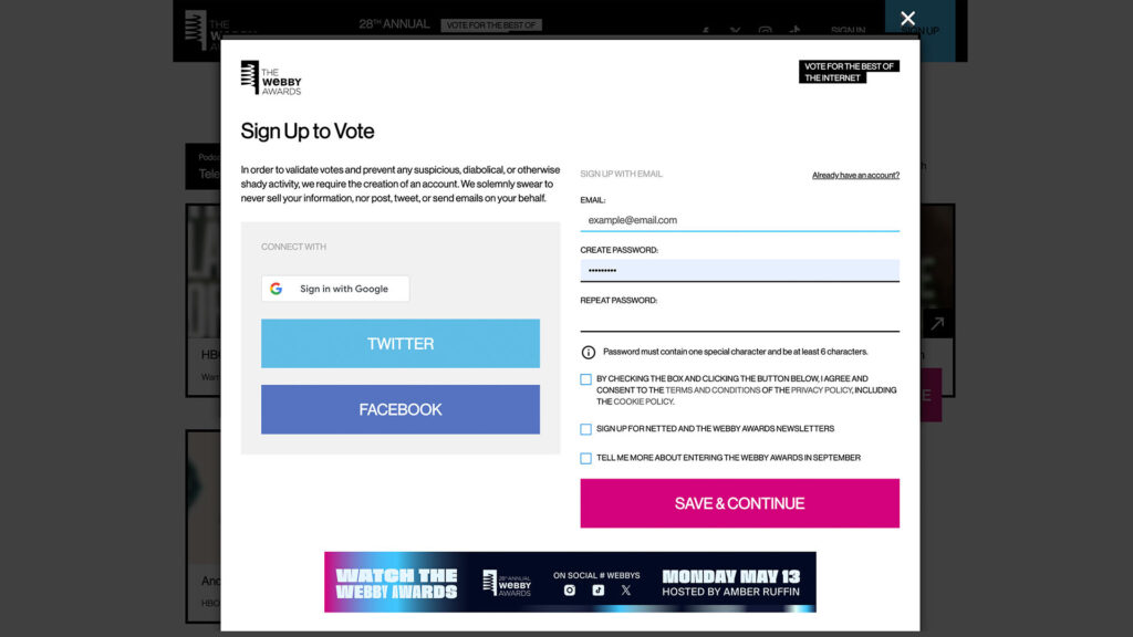 You will need to create or sign into an existing Webby Awards account to cast your vote.  All you need is your email and a password you can select.