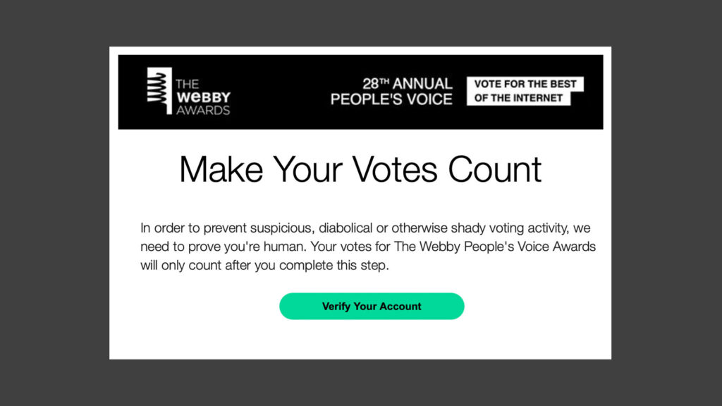 Your vote won’t count until you confirm it via email the Webby Awards will send to you.