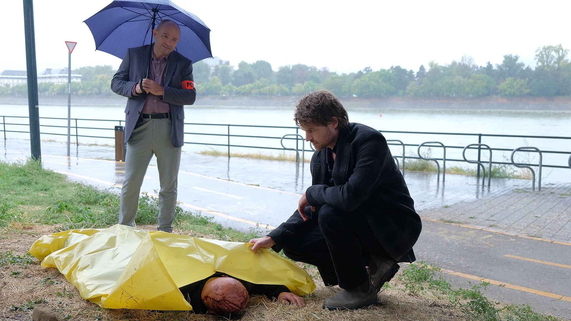 But when we filmed that, it was the first time it had rained in maybe a month. Everyone had been so hot for so long, so there was this big relief. And suddenly blue lights, body under a sheet, stepping under the crime tape—all of these classic tropes from crime dramas—and I was like, “Oh, hang on. Yeah, we’re doing it, here we go. Back to the beginning. This is where it all begins.”