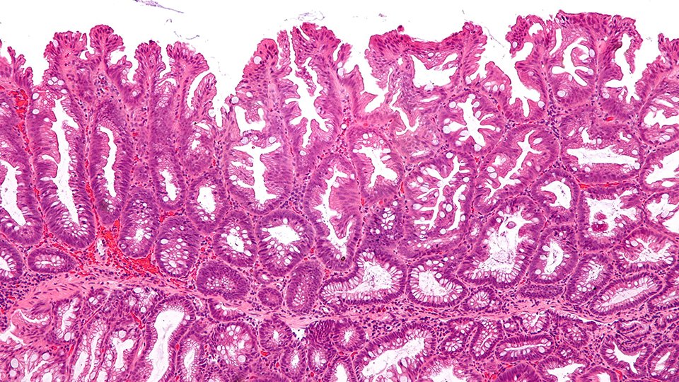 Micrograph of a colorectal sessile serrated lesion, which is most commonly seen in the cecum and ascending colon, and has the potential to lead to colorectal cancer. Image credit: Nephron, Wikimedia Commons