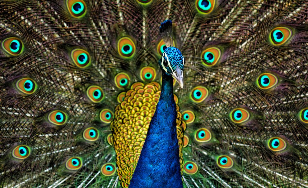 Promiscuous male peacocks flash their colorful plumage to attract females, which are noticeably more drably feathered. Males and females of monogamous bird species, on the other hand, tend to resemble each other more. Image Credit: Jatin Sindhu, Wikimedia Commons