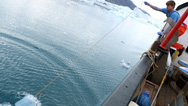 Ari: Ten to 15 miles farther down the fjord, we leave the mélange behind and the icebergs drift more freely. Ths fjord connects Helheim and the North Atlantic. Along the way, the icebergs melt. And all the while, water, in the form of snow, has been falling upon the Greenland ice sheet, replenishing Helheim and other glaciers like it.