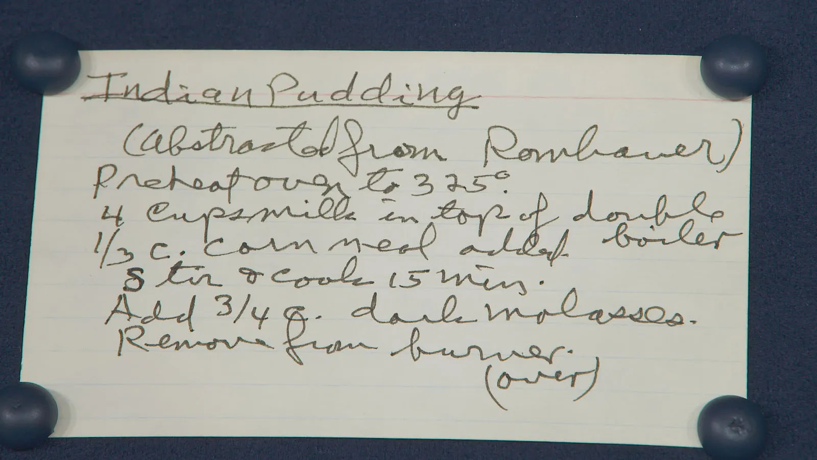 Indian Pudding (Abstracted from Rombauer) Preheat oven to 325° 4 cups milk in top of double boiler ⅓ c. cornmeal added Stir and cook 15 mins Add ¾ c. dark molasses Remove from burner (over) Add ¼ c. butter 1 tsp salt 1 tsp ginger { Cool about 5 min 3 tb. spoons sugar ½ tsp cinnamon Pour into greased baking dish Bake 1 ½ - 2 hr. Serve hot! If barbaric, top with vanilla ice cream!!