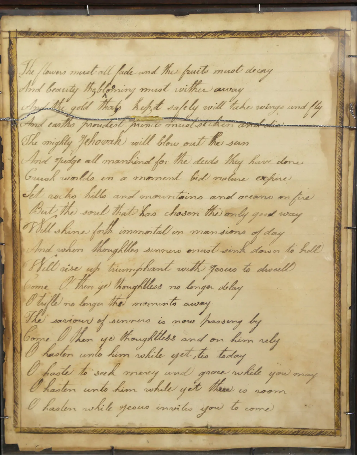 The religious fervor of this unknown young girl is evident in the lines of the poem she composed and inscribed on the reverse of the painting. Her verses evoke the ideas of redemption through Jesus, emphasizing the belief that even the most beautiful among the living will perish without being saved by Him.
