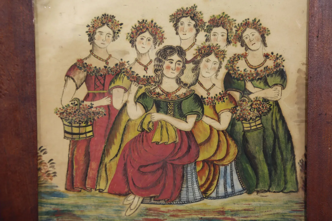 The painting depicts seven women, six of whom wear crowns made of flowers, all with solemn expressions. The painting is framed, with a glass panel on the back, revealing a fabric-like piece of paper containing a religious poem. Appraiser Karen Keane noted that the watercolor was most likely painted by a school-aged girl in the early 19th century, due to the subject of the painting and the theme of the poem.