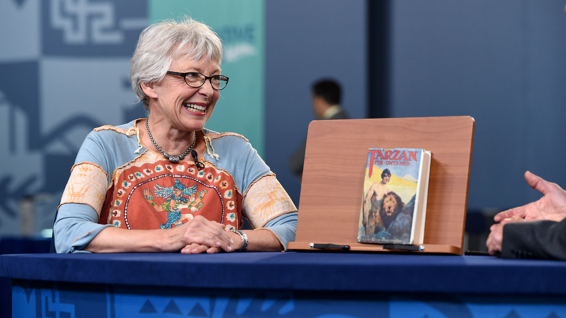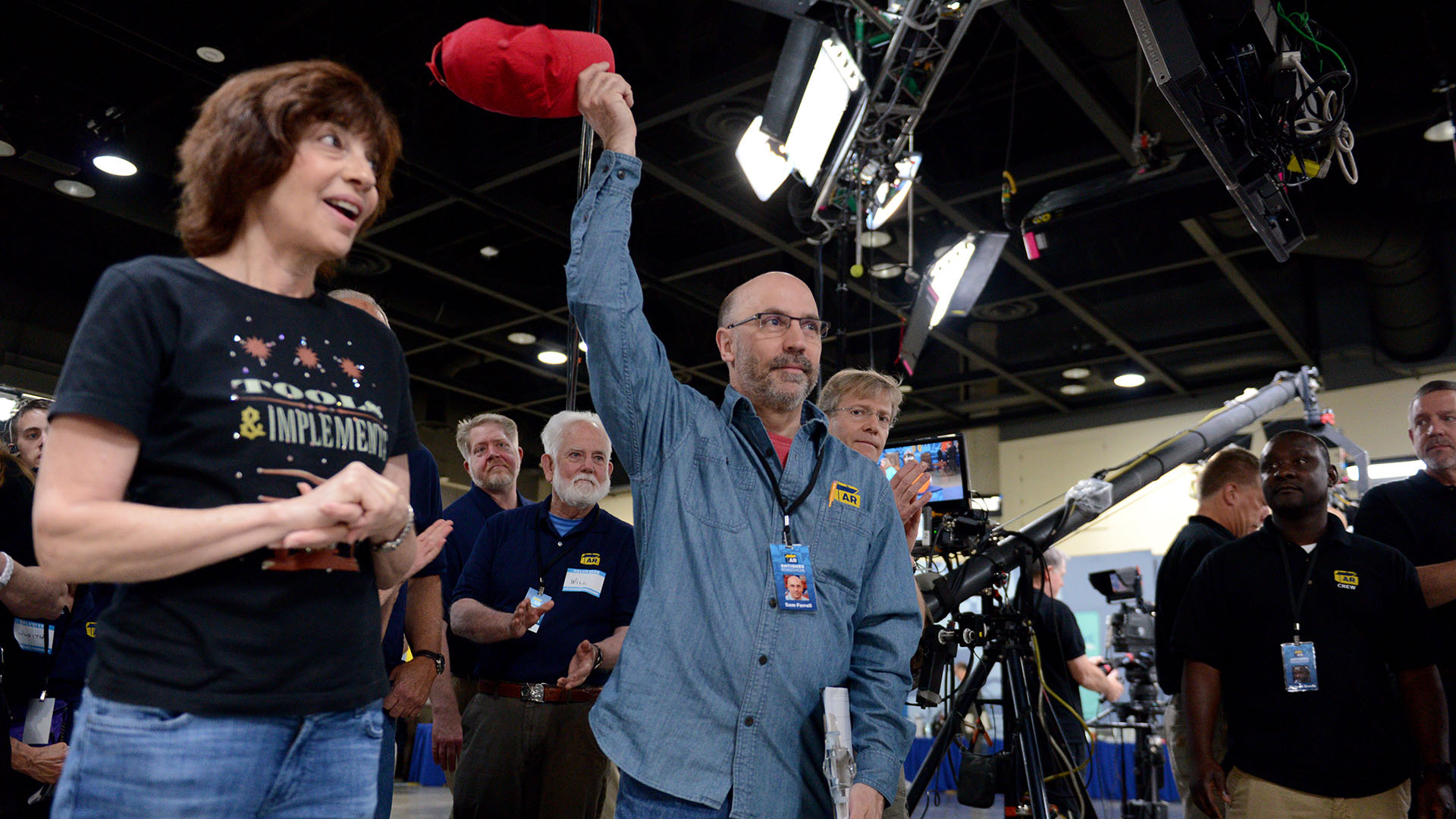 A guest hugs an appraiser at the June 6 ANTIQUES ROADSHOW event in Spokane, Washington. (Photo credit: Meredith Nierman)