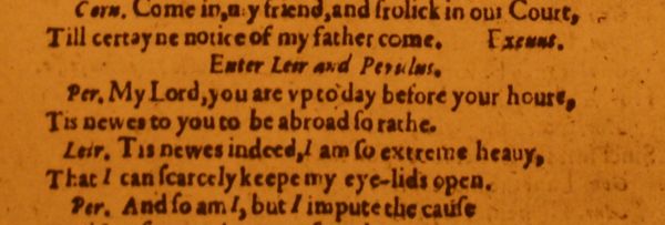 In the longest scene of the play, Leir and Perillus come to the place of assignation with Ragan, stretch, take out books, and fall asleep. The messenger enters with daggers in either hand, considers killing them immediately, but remembers Ragan’s requirement to show them the letter. He takes their books away, they awake, wonder what happened to Ragan, thinking perhaps they misunderstood the place. Leir then reports a dreadful dream, dismissed by Perillus, in which Leir is stabbed by his elder daughters but then nursed to recovery by Cordella. The assassin reveals himself, clearly threatening. (What happens next is hard to take seriously, and if done right would be quite funny, with both sight and verbal gags.)