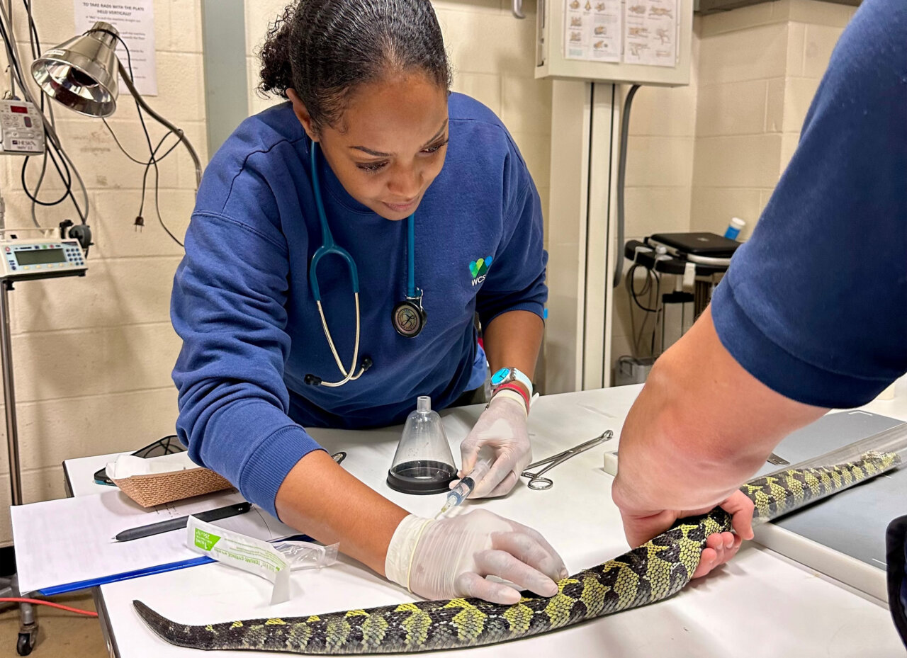 Fluid administration to an Ethiopian pit viper. Photo credit: Cheryl Stout, DVM ©️WCS