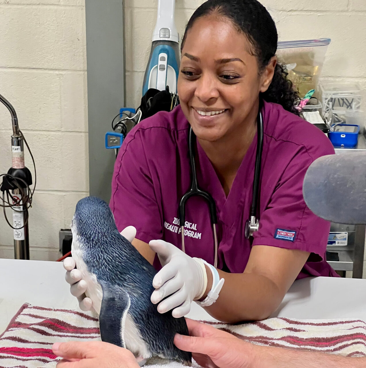 Little blue penguin awaits radiographs and gait assessment. Photo credit: Olivia Berkner, LVT ©️WCS